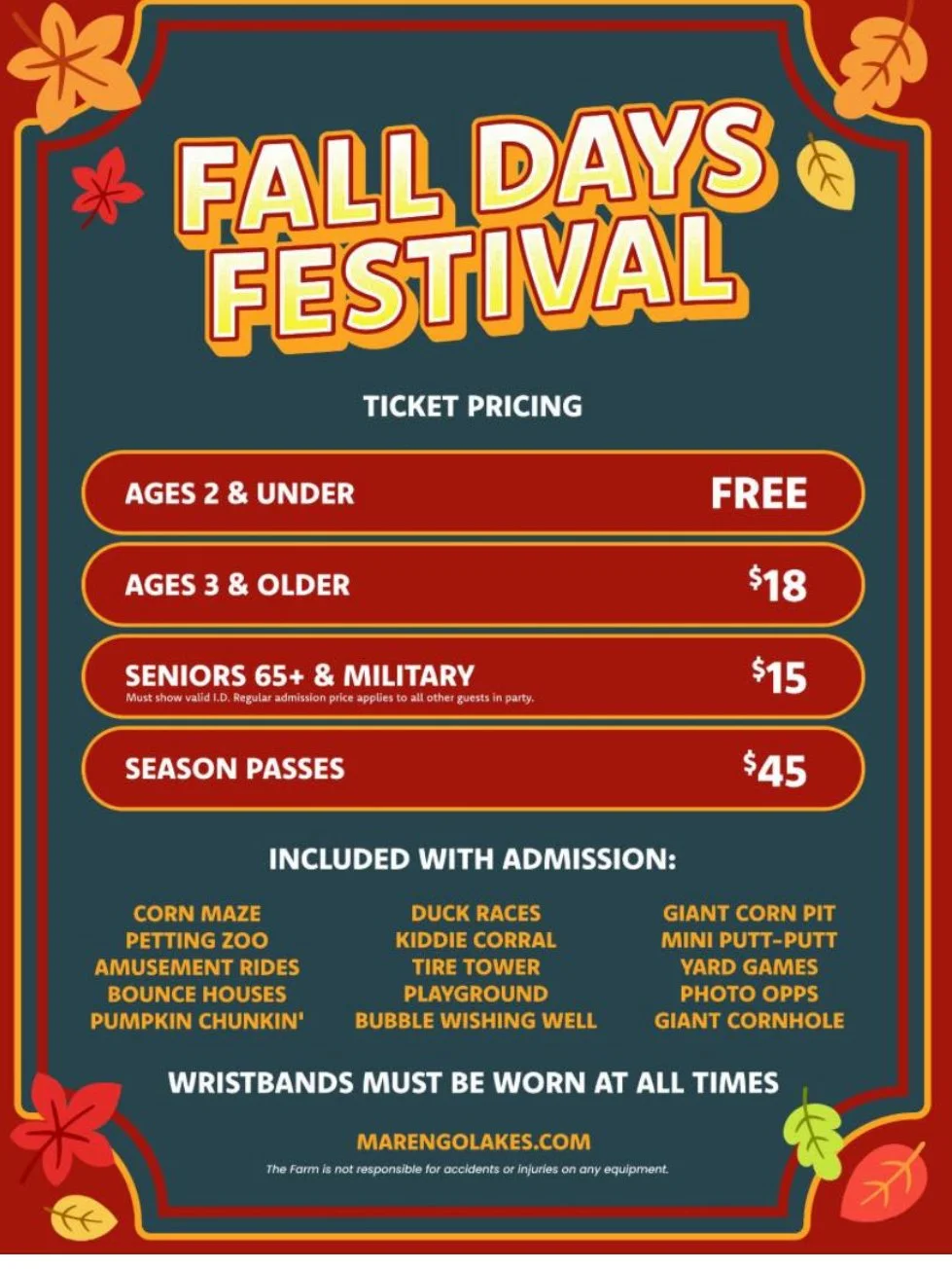 🎟️ Get your tickets at our ticket box or here: https://marengolakes.ticketspice.com/the-fall-days-festival
